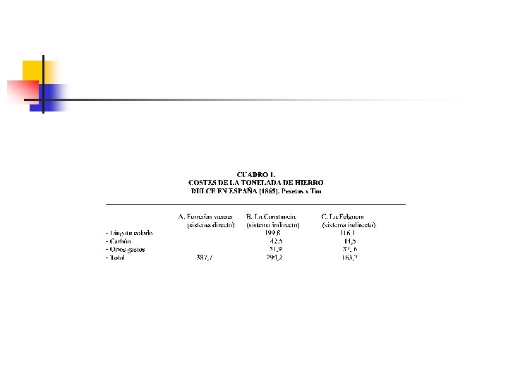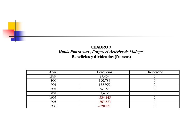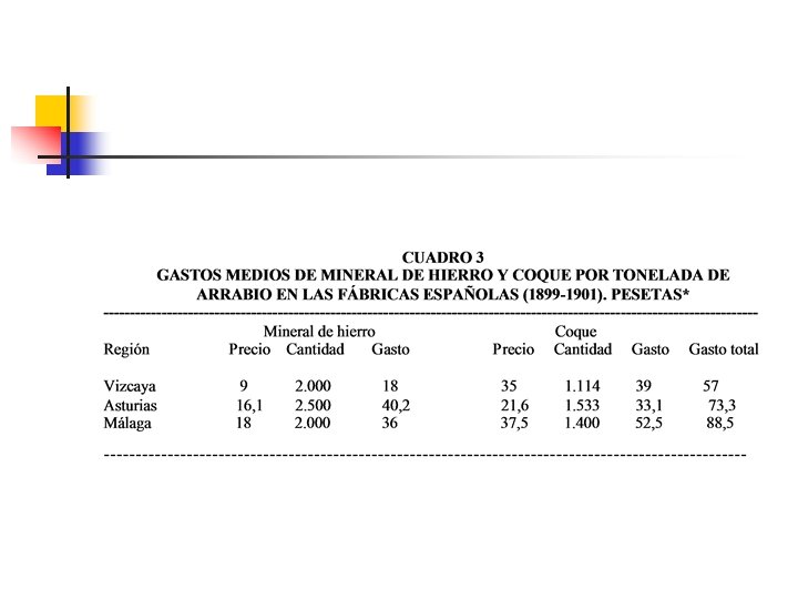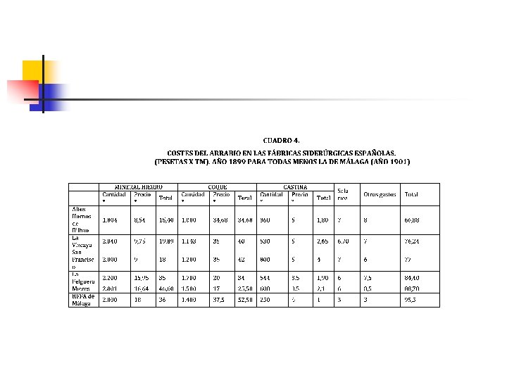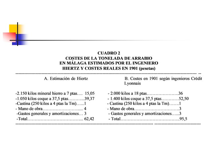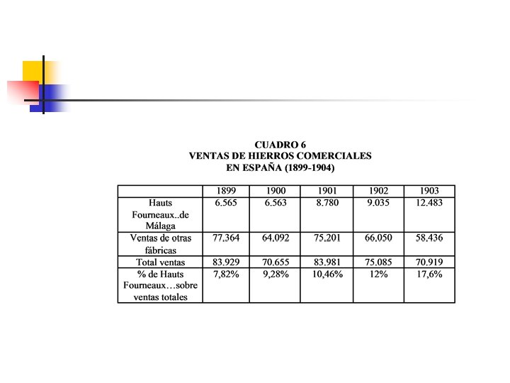 PUNTOS FUERTES Y DÉBILES DE HAUTS FOURNEAUX SEGÚN LOS INGENIEROS DEL CRÉDIT LYONNIAS (1901): n A) Puntos fuertes: n 1. Buena ubicación para vender en el mercado mediterráneo n 2) Utillaje en buen estado n 3) Concentración vertical mineral de hierro n 4) Mano de obra barata B) Puntos débiles: n 1. Coque caro y de baja calidad que subiría de precio n 2. Irregularidad de suministros por ineficiencia de Ferrocarriles Andaluces n 3. Mala dirección n 4. Mano de obra mediocre n