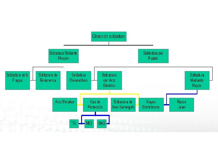 Clasificación de los tipos de soldadura - Soldadura heterogénea. Se efectúa entre materiales de distinta naturaleza, con o sin metal de aportación: o entre metales iguales, pero con distinto material de aportación. Puede ser blanda o fuerte. - Soldadura homogénea. Los materiales que se sueldan y el metal de aportación, si lo hay, son de la misma naturaleza. Puede ser oxiacetilénica, eléctrica (por arco voltaico o por resistencia), etc. Si no hay metal de aportación, las soldaduras homogéneas se denominan autógenas.