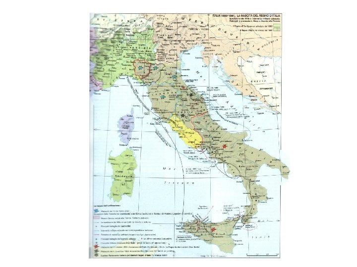 LA CAMPAGNA SUL CONTINENTE 19 agosto: Garibaldi supera lo stretto di Messina 7 settembre: entra a Napoli -Non incontra resistenze significative -Diversi episodi di rese senza combattere -Episodi di soldati che si ribellano o uccidono i comandanti borbonici traditori - La battaglia del Volturno (1°-10 -1869): tentativo dei borboni di contrattaccare; vittoria dei garibaldini appoggiati dai piemontesi. “Altra circostanza favorevole alla causa nazionale: il tacito consenso della marina militare borbonica Che avrebbe potuto, se interamente ostile, ritardare molto il nostro progresso verso la capitale. E veramente i nostri piroscafi trasportavano i corpi dell’esercito meridionale lungo tutto il litorale napoletano senza ostacoli” (Garibaldi, Memorie)