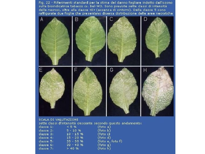 Un fenomeno ricorrente nelle valutazioni quantitative delle risposte fogliari delle piante bioindicatrici è la sovrastima delle porzioni “minoritarie”. Infatti, in ossequio alla legge di Weber-Fechner, secondo cui la risposta di un organismo ad uno stimolo è funzione lineare del suo logaritmo, l’occhio legge in termini logaritmici, tendendo a dare: maggiore risalto a poche lesioni necrotiche presenti su una superficie uniforme (sovrastima delle classi inferiori di danno); a poche aree verdi residuali in una foglia severamente danneggiata (sottostima della classi superiori). Questo comporta la necessità di un idoneo addestramento degli operatori.
