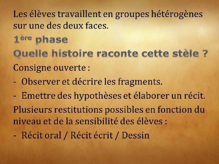 Présentation des fragments - 180 x 130 x 11 cm Hypothèses puis définition du mot stèle 2 1 3 4 La face « historique » La face « mythologique»