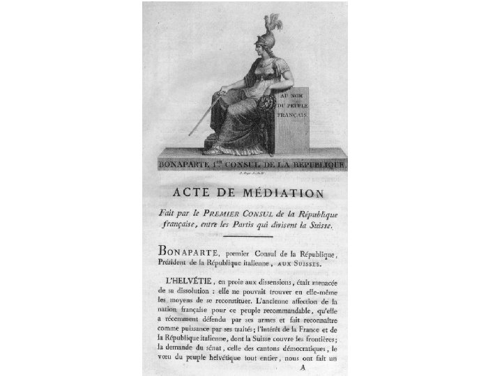 Acte de Médiation 1803 "La Suisse ne ressemble à aucun autre État, soit par les événements qui s'y sont succédé depuis plusieurs siècles, soit par la situation géographique, soit par les différentes langues, les différentes religions, et cette extrême différence de moeurs qui existe entre ses différentes parties. La nature a fait votre État fédératif, vouloir la vaincre n'est pas d'un homme sage" Après avoir rappelé la situation politique de la Confédération avant la révolution (domination de certains cantons sur certains territoires, gouvernement aristocratique de certains canton), Bonaparte conclut : "Ce qui est en même temps le désir, l'intérêt de votre nation et des vastes États qui vous entourent est donc : 1° l'égalité des droits entre vos dix-huit cantons ; 2° une renonciation sincère et volontaire aux privilèges de la part des classes patriciennes ; 3° une organisation fédérative, où chaque canton se trouve organisé suivant sa langue, sa religion, ses moeurs, son intérêt, son opinion »