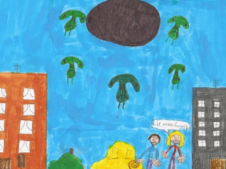 AQUELLA MAÑANA EN EL TRULLO… UNA MAÑANA EN UN PUEBLO LLAMADO TRULLO, PASÓ ALGO INEXPLICABLE… ¡¡¡¡¡¡LLEGARON LOS MARCIANOS!!!!!! LA GENTE QUE VIVÍA ALLÍ SE ASUSTÓ MUCHO, TODOS LLAMABAN A LOS BOMBEROS, A LOS GUARDIAS URBANOS Y A LAS PATRULLAS MILITARES. RITA Y PAOLO ERAN UNOS NIÑOS QUE VIVÍAN EN ESTE PUEBLO, TENÍAN UN PERRO AL QUE LLAMABAN ZORRO, EN SU BALCÓN CAYÓ UN TROZO DE ALGO QUE AL PARECER ERA CHOCOLATE. CUANDO RITA Y PAOLO MIRARON HACIA ARRIBA, VIERON ALGO REDONDO EN EL CIELO Y VIERON QUE UNA PIZZA ENORME VENÍA VOLANDO HACIA ELLOS, ¡¡¡¡¡¡UNA PIZZA!!!!!!, (EN EL TRULLO PARA NOMBRAR UNA PIZZA O UNA TARTA SE DICE PIZZA, SOLO QUE PARA DIFERENCIARLAS, SE DICE PIZZA DULCE A LA TARTA).