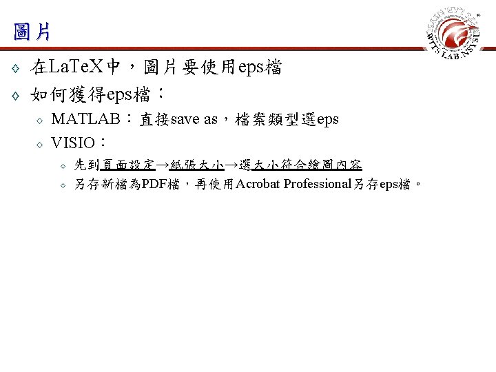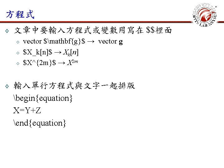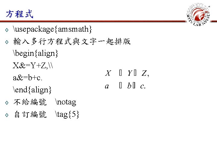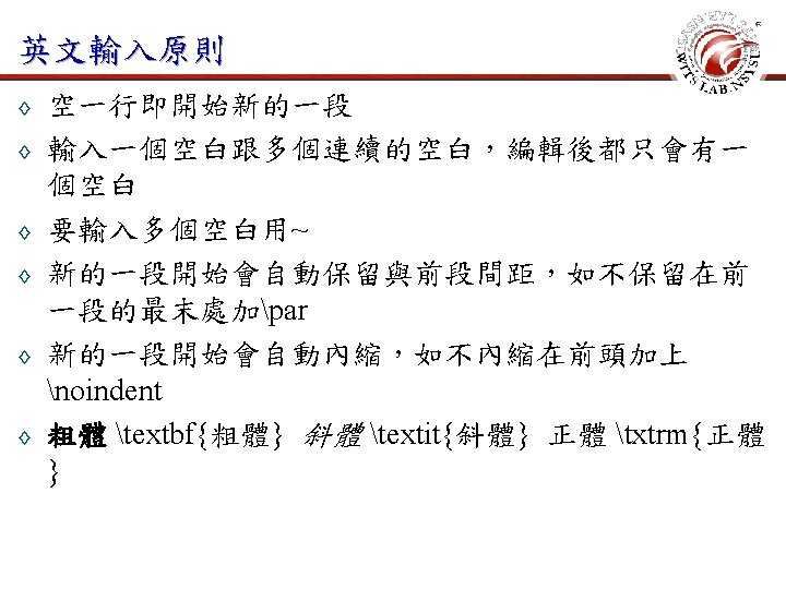 常用指令 ◊ ◊ 開始新的一頁 newpage 本頁不顯示頁碼 thispagestyle{empty} 設定頁碼計數器值 setcounter{page}{1} 設定字體大小與行高 fontsize{12}{24 pt}selectfont
