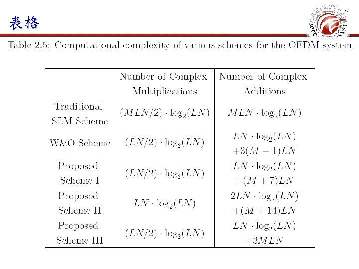 表格 begin{table}[t] caption{Computational complexity of various schemes for the OFDM system}label{CC_analysis_OFDM} begin{center} begin{tabular}{c|c|c} hline & $begin{array}{c} textrm{Number of Complex}~\ textrm{Multiplications} end{array}$ & $begin{array}{c} textrm{Number of Complex}~\ textrm{Additions}end{array}$ \ hline $begin{array}{c} textrm{Traditional}~\ textrm{SLM Scheme} end{array}$ & $(MLN/2) cdot log_2(LN)$ & $MLN cdot log_2(LN)$ \ hline $begin{array}{c} textrm{W&O}~textrm{Scheme} end{array}$ & $(LN/2) cdot log_2(LN)$ & $begin{array}{c}LN cdot log_2(LN)\+3(M-1)LNend{array}$ \ hline $begin{array}{c} textrm{Proposed}~\ textrm{Scheme I}end{array}$ & $begin{array}{c}(LN/2)cdot log_2(LN)end{array}$ & $begin{array}{c}LN cdot log_2(LN)\+(M+7)LNend{array}$\ hline $begin{array}{c} textrm{Proposed}~\ textrm{Scheme II}end{array}$ & $begin{array}{c}LNcdot log_2(LN)end{array}$ & $begin{array}{c}2 LN cdot log_2(LN)\+(M+14)LNend{array}$\ hline $begin{array}{c} textrm{Proposed}~\ textrm{Scheme III}end{array}$ & $begin{array}{c}(LN/2)cdot log_2(LN)end{array}$ & $begin{array}{c}LN cdot log_2(LN)\+3 MLNend{array}$\ hline end{tabular} end{center} end{table}