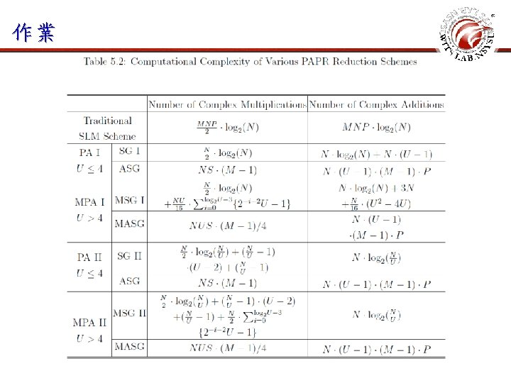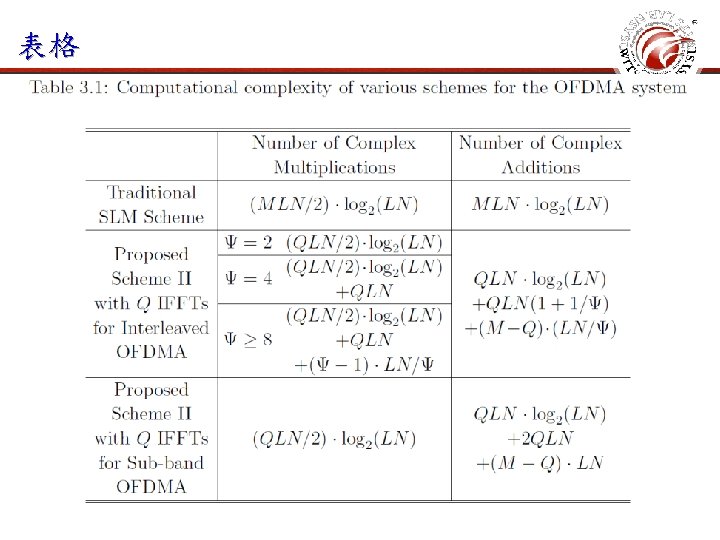 表格 begin{table}[t] caption{Computational complexity of various schemes for the OFDMA system} label{CC_analysis} begin{center} extrarowheight=1 pt doublerulesep=1 pt tabcolsep=-0. 5 pt begin{tabular}{c|c|c|c} hline & multicolumn{2}{c}{$begin{array}{c} textrm{Number of Complex}\ textrm{Multiplications} end{array}$}vline & $begin{array}{c} textrm{Number of Complex}\ textrm{Additions}end{array}$ \ hline $begin{array}{c} textrm{Traditional} \ textrm{SLM Scheme} end{array}$ & multicolumn{2}{c}{$(MLN/2) cdot log_2(LN)$}vline & $MLN cdot log_2(LN)$ \ hline multirow{6}*{$begin{array}{c} textrm{Proposed}\textrm{Scheme II}\ textrm{with $Q$ IFFTs}\ textrm{for Interleaved}\ textrm{OFDMA}end{array}$} & $~Psi=2~$ & $(QLN/2)!cdot! log_2(LN)$ & multirow{6}*{$begin{array}{c}QLN cdot log_2(LN) \+QLN(1+1/Psi)\ +(M!-!Q)!cdot! (LN/Psi)end{array}$}\ cline{2 -3}&$~Psi=4~$ & $begin{array}{c} (QLN/2)!cdot! log_2(LN)\ +QLNend{array}$ & \ cline{2 -3}&$~Psigeq 8~$ & $begin{array}{c} (QLN/2)!cdot! log_2(LN) \ +QLN\+(Psi-1)cdot LN/Psiend{array}$& \ hline $begin{array}{c} textrm{Proposed}\textrm{Scheme II}\ textrm{with $Q$ IFFTs}\ textrm{for Sub-band}\ textrm{OFDMA}end{array}$ & multicolumn{2}{c}{$begin{array}{c}(QLN/2)cdot log_2(LN)end{array}$} vline& $begin{array}{c}QLN cdot log_2(LN) \+2 QLN\ +(M-Q)cdot LNend{array}$\ hline end{tabular}% end{center} end{table}