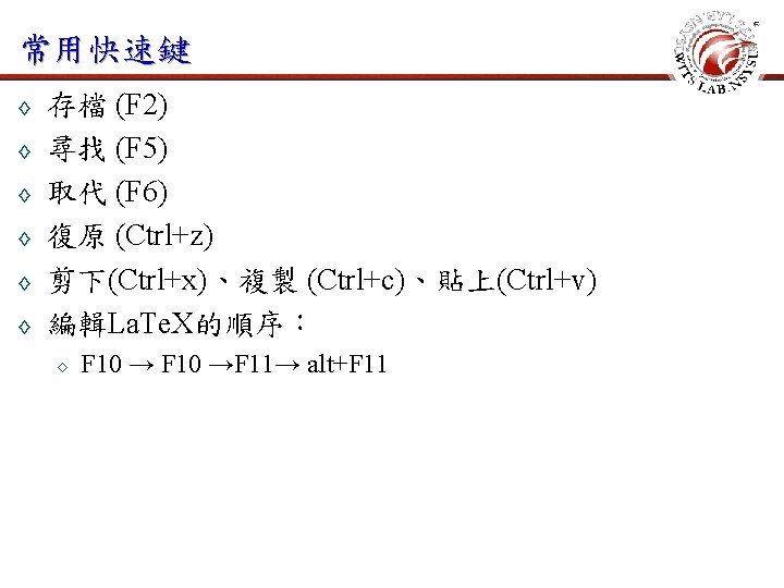 操作環境 La. Te. X (F 10) save (F 2) 檔案標籤 dvi 2 ps (F 11) PS 2 PDF (Alt+F 11)