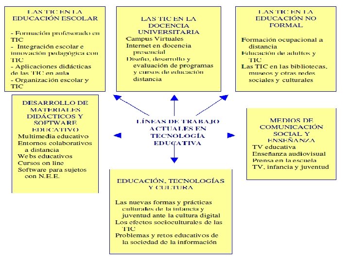 La T. E debe reconceptualizarse como ese espacio intelectual pedagógico cuyo objeto de estudio son los medios y las tecnologías de la información y comunicación en cuanto formas de representación, difusión y acceso al conocimiento y a la cultura en los distintos contextos educativos: escolaridad, educación no formal, educación informal, educación a distancia y educación superior.