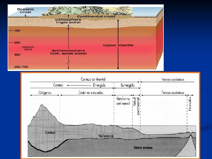 MODELO DINÁMICO Litosfera: Capa rígida que engloba CORTEZA + parte del MANTO SUPERIOR La litosfera está FRAGMENTADA en las PLACAS LITOSFÉRICAS Su espesor es de unos 100 km Astenosfera: - Capa plástica (parte de las rocas están fundidas). - Coincide con el canal de baja velocidad - Se ha descubierto que no es realmente una capa, sino que es discontinua Mesosfera: Hasta el límite con el núcleo externo. Endosfera: Comprende el NÚCLEO