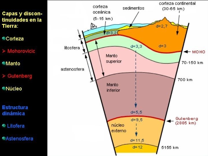 MODELO GEOQUÍMICO Corteza: Capa sólida. Su espesor varía: Bajo el océano: 6 - 12 km Bajo los continentes: 25 - 70 km Es la menos densa (con silicatos de Al). Manto: - Capa sólida aunque con cierta plasticidad. Gran espesor. - Más densa que la corteza (con silicatos de Mg y Fe) -Su límite se sitúa a 2900 km (Discontinuidad de Gütemberg). Núcleo: Muy denso. Con silicatos de Fe y Ni. Tiene un espesor de unos 3400 km. Con: Núcleo Externo: muy denso y en estado líquido (las "ondas S" desaparecen a partir de él). Núcleo Interno: la capa más densa de la Tierra. Suponemos que sólida y de carácter metálico. Forma la parte central del planeta.