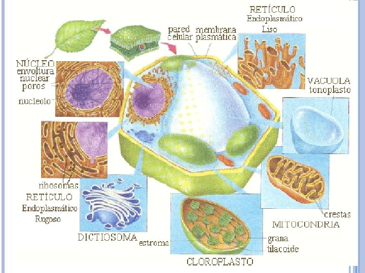 LOS ORGANELOS DE CÉLULAS VEGETALES v Los plastidios : funcionan como fábricas de productos químicos y otros como almacenes de alimentos y pigmentos. El cloroplasto es el más común en las células de las plantas verdes. Aquí se elaboran alimentos, gracias a la clorofila que atrapa la energía solar. Los leucoplastos contienen proteínas, lípidos o almidón almacenados Los cromoplastos contienen pigmentos rojos, amarillos o anaranjados. Vacuola: regula cantidad de agua y sales dentro de la célula, en su interior hay grandes concentraciones de agua, sales, enzimas. v Pared celular: es una cubierta externa formada por celulosa y lignina , En los hongos esta compuesto por un polisacárido quitina. Su función es estructural, comunica la célula con el exterior y manda señales al interior. v