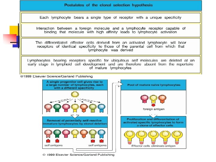 La teoria dell’educazione e della selezione clonale: TEORIA DELL’EDUCAZIONE n Nell’organismo non esistono tanti cloni di linfociti diversi, quelli presenti si “adattano” al patogeno incontrato di volta in volta, diventando specifici per esso. Da vari decenni, grazie a numerose prove sperimentali, si è visto che tale teoria è del tutto infondata. TEORIA DELLA SELEZIONE CLONALE (Jerne, 1955) n Quando il patogeno viene a contatto col sistema immunitario, seleziona il clone di linfociti specifico per esso e già preformato all’interno del repertorio. Vi è un numero elevato di cloni linfocitari ognuno dei quali deriva da un singolo precursore ed è in grado di legare un singolo detrminante.