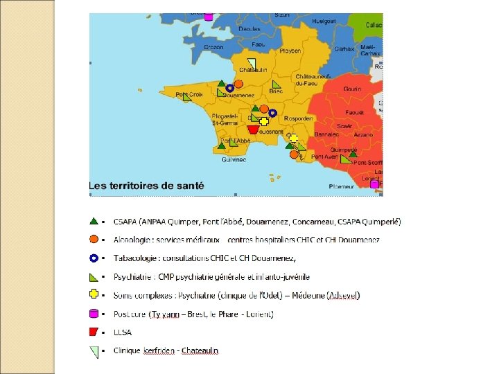 Grandes étapes de la FILIERE DE SOINS ADDICTOLOGIQUES du T. S. n° 2 (2) v Suivi Ambulatoire : Regroupement de 2 Csapa l’un hospitalier, spécialisé dans l’accompagnement et la prise en charge des personnes souffrants d’une dépendance aux drogues dures et l’autre associatif spécialisé dans l’accompagnement et la prise en charge des personnes souffrants d’une dépendance aux autres produits et aux dépendances sans produit (addictions aux jeux, troubles des conduites alimentaires, etc) =>CSAPA généraliste avec une intervention sur un site principal et 3 antennes (Douarnenez, Pont l’Abbé, Concarneau). Equipe mixte associant une équipe de l’ANPAA et une équipe hospitalière v Structures de niveau 1 (Sevrages simples) : § Certains services de médecine des 4 hôpitaux : service de post urgences de Douarnenez, service de Gastroentérologie de Pont l’Abbé, service de médecine Ouest de Concarneau § Services de psychiatrie générale des 3 secteurs de psychiatrie adulte de l’EPSM Gourmelen § Clinique psychiatrique privée Kerfriden à Chateaulin => Projet de développer une pratique de sevrages en ambulatoire à partir des consultations de l’ELSA, du CSAPA, des structures de niveau 2, en lien avec les médecins généralistes traitants des patients