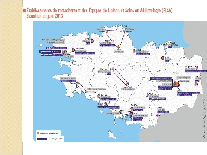 OBJECTIFS DE LA FILIERE q Favoriser la coordination des dispositifs de prise en charge autour des missions suivantes: Consultations d’évaluation, de dépistage précoce, d’orientation et de prise en charge au long cours, Mise en place d’une ELSA territoriale multisites Mise en place d’un suivi spécialisé avec recours éventuel à des séjours en structures spécialisées(cures, post cures). Renforcement du partenariat avec le SSR Ty Yann Renforcer les liens avec les équipes chargées des missions de prévention et de réduction des risques(CAARUD) afin qu’elles puissent avoir une bonne connaissance des différents maillons sur le territoire