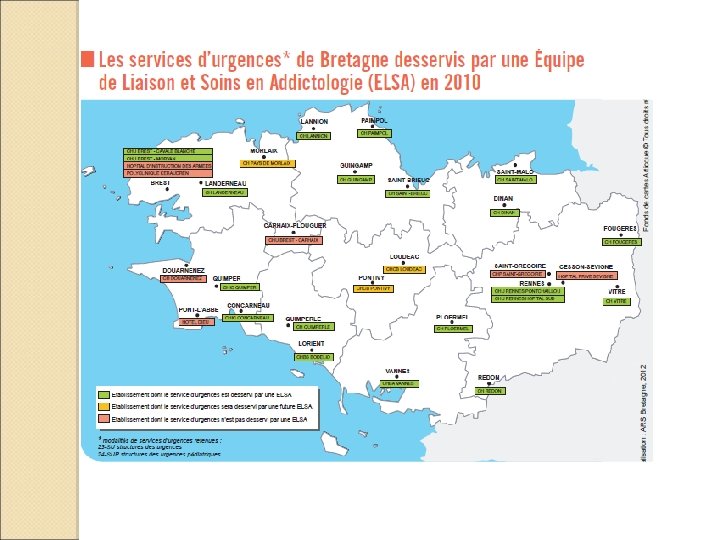 Fonctionnement et organisation � Coordination territoriale de l’ELSA assurée par un médecin encadrant l’activité sur le CHIC � Coopération à l'échelle de la filière addictologie et dans le cadre de l‘Union Hospitalière de Cornouaille (cf infra) � Intégrée dans le comité de pilotage de la filière composé par: � � � � le CHIC, l’EPSM E Gourmelen, le CH de Douarnenez, l'Hôtel Dieu de Pont l'Abbé, le SSR Ty Yann (Brest), (Fondation Centre Hélio Marin, future Fondation ILDYS). L’ANPAA (dans le cadre du CSAPA généraliste) La clinique kerfriden - Châteaulin