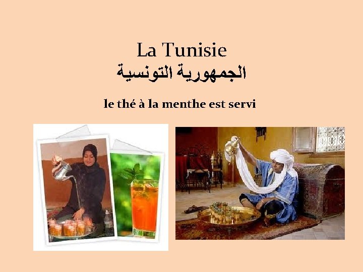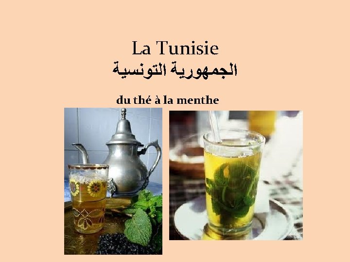 La Tunisie ﺍﻟﺠﻤﻬﻮﺭﻳﺔ ﺍﻟﺘﻮﻧﺴﻴﺔ Une tagine est la poterie est aussi le plat. La tigane est servie avec du cous.