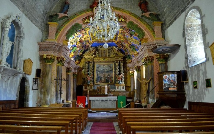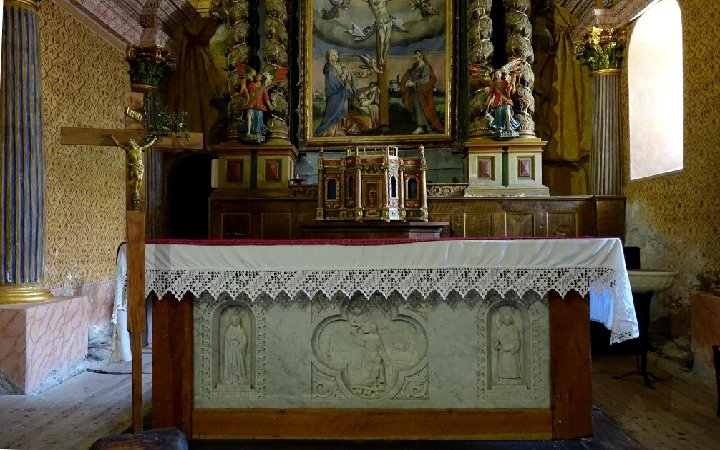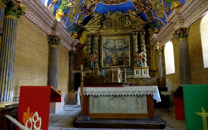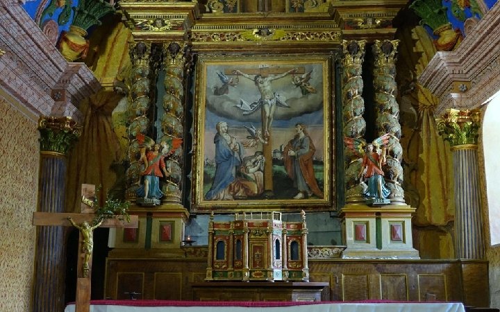 L'ÉGLISE SAINT-ROMAIN DE MOLINES-EN-QUEYRAS • • • Molines est une commune du Queyras qui compte un peu plus de 300 habitants. Elle est irriguée par l'Aigue Agnelle, descendant du col du même nom qui sert de frontière avec l'Italie. Aigue signifie "eau". Ses versants sont peuplés principalement de mélèzes qui ont la particularité de roussir en automne avant de perdre leurs "feuilles" en hiver. L'histoire de sa célèbre église Saint Romain épouse celle du village et des vallées du Queyras Molines. Cette histoire a été écrite dans les "transitons de Molines", du nom donné aux chemins qui longeaient les canaux, cahiers où on notait l'état des canaux, mais aussi les faits marquants et surtout tragiques du village depuis 1469 jusqu'à 1908. L'église fut détruite pendant les guerres de religion et reconstruite entre 1628 et 1637. Les cloches sont apparentes en haut d'un clocher carré couvert d'une toiture en mélèze après la destruction de sa flèche la plus grande du Queyras au cours des guerres de religions. L'église a été rénovée en 2011. La construction de l'église remonte selon toute vraisemblance à la fin du XVe siècle. Elle a été conçue dans la tradition romane, avec une nef de trois travées couvertes d'une voûte en berceau en tuf appareillé et un chœur à chevet plat. Le porche qui protégeait le portail sud fut sans doute détruit pendant les guerres de religion. Les décors de la façade sud sont en cours de restauration. La décoration intérieure de l'église Saint Romain de Molines a souvent été jugée "de mauvais goût" au XIXe siècle. Cette décoration très "baroque" est néanmoins exceptionnelle. Comment ne pas être ébloui devant un tel décor réalisé en 1692 par le sculpteur Gégout puis repeint en 1754 ? C'est un foisonnement de couleurs, de volutes, d'angelots aguicheurs, de dorures, de peintures et d'entrelacs de plâtre qui s'offrent au regard, sur l'arc et la voûte du chœur. Dans le chœur un magnifique retable du XVIIIe siècle, sculpté par des artistes italiens de Saluces. Indissociable du décor baroque de Gégout, cette représentation du Calvaire, sur l'arc triomphal, avec Marie-Madeleine au pied du Christ en croix, Marie et Jean de chaque côté.