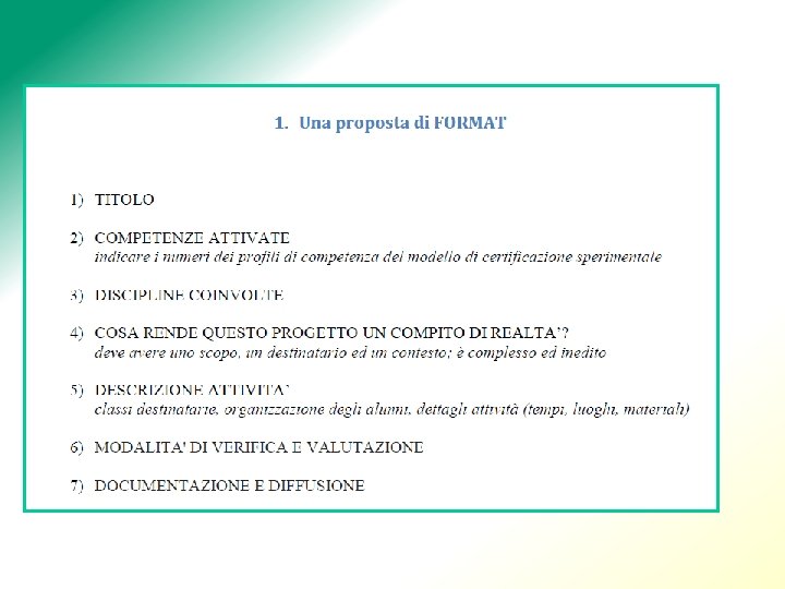 FORMAT DEL COMPITO DI REALTA’ Complessità e novità Il compito deve essere articolato in modo tale che le risposte non siano di immediata e facile individuazione. La situazione-problema posta, inoltre, deve essere inedita, ossia si deve presentare per la prima volta agli alunni, altrimenti si annulla la problematidtà e si entra nel tradizionale campo della restituzione dell'appreso. Contesto luogo e tempo Un compito di realtà per essere reale deve necessariamente indicare il contesto, i tempi e i luoghi di realizzazione. il principio di realtà può essere assicurato anche con la trasposizione temporale o spaziale del contesto e quindi con situazioni immaginate come possibili. Disdplinarità e pluri·interdisdplinarità È preferibile che il compito di realtà sia pluri- inter- disdplinare, ma non si esclude che possa essere disdplinare. In ogni modo vanno sempre indicate le discipline coinvolte.