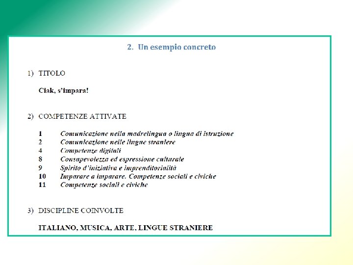 COMPETENZE: COME PROMUOVERLE? 1. Essenzializzare: la ricerca dei nuclei fondanti 2. Integrazione disciplinare: linguaggio 3. Sviluppo di conoscenze procedurali 4. Problematizzazione dell’apprendimento 5. Contestualizzazione 6. Costruzione sociale 7. Didattica laboratoriale - Operare per progetti 8. Compiti di realtà 9. Apprendimento come cognizione situata 10. Sviluppo dei processi cognitivi