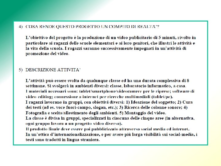 Compiti di realtà finali e intermedi In una Unità di Apprendimento, oltre al compito di realtà finale che viene svolto per tutta la durata dell'attività, possono essere previsti anche compiti di realtà intennedi che richiedono minor tempo di svolgimento. Conoscenze acquisite e da acquisire Le conoscenze necessarie alla realizzazione del compito di realtà possono essere già acquisite totalmente o in parte, oppure vengono acquisite lungo il percorso. Individuale e collettivo È preferibile che un compito di realtà venga svolto da un gruppo ristretto di alunni, ma non è esduso che in alcune circostanze possa essere svolto in fonna individuale. Destinatario e scopo Indicare il destinatario e lo scopo del prodotto finale da elaborare rappresenta un altro ineludibile principio di realtà.