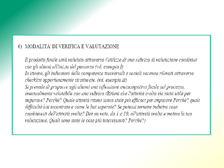 Valutazione Ø RIFLESSIVA - METACOGNITIVA • Se il pensiero tende ad essere sempre più etnografico e negoziabile, i processi valutativi tendono ad essere sempre più idiografici, si affidano a tecniche narrative, interpretative e soprattutto riflessive. • La metariflessione orale costituisce anche una occasione straordinaria per insegnare agli studenti in modo individualizzato a riflettere sui loro lavori e per sviluppare in loro una struttura cognitiva più ricca e critica