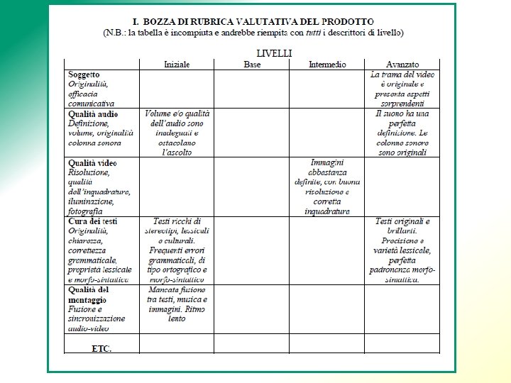 • (3) Sulla base dei punti 1 e 2 si individuino gli elementi importanti della rubric. Soprattutto in questa fase, è importante la condivisione con gli studenti. E’ qui che, del sistema complessivo da valutare, si estraggono quelli che riteniamo gli elementi importanti (indicatori di competenza o di qualità del prodotto). Evitare un numero troppo alto, pena la frammentarietà dell’informazione e la difficoltà della compilazione. Un numero superiore a 6/7 elementi suggerisce il passaggio ad una seconda rubric.