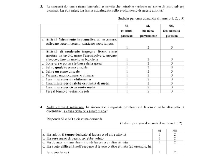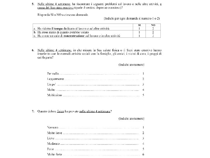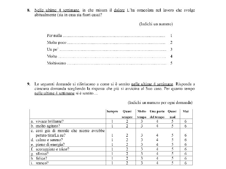 Short Form 36 (SF-36) Indaga su due aspetti della salute FISICA MENTALE 36 ITEMS 8 DIMENSIONI Attività fisica (AR); Ruolo e salute Fisica (RF); Dolore Fisico (DF); Salute in Generale (SG); Vi. Talità (VT); Attività Sociali (AS); Ruolo e stato Emotivo (RE); Salute Mentale (SM). SCALA COMPONENTI FISICHE (PCS) SCALA COMPONENTI MENTALI (MCS)