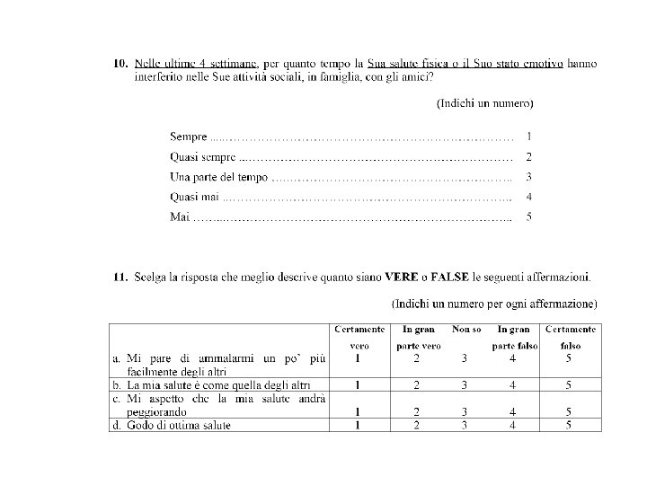 Es. di dimensioni correlate alla salute Dimensioni HRQo. L n Benessere fisico: mobilità, capacità di eseguire alcune attività fisiche n Benessere psicologico: stato cognitivo, ansia, depressione n Benessere sociale: capacità di interazione sociale, comunicatività n n Benessere di ruolo: capacità lavorativa e produttiva, capacità di eseguire le normali attività domestiche Stato di salute generale