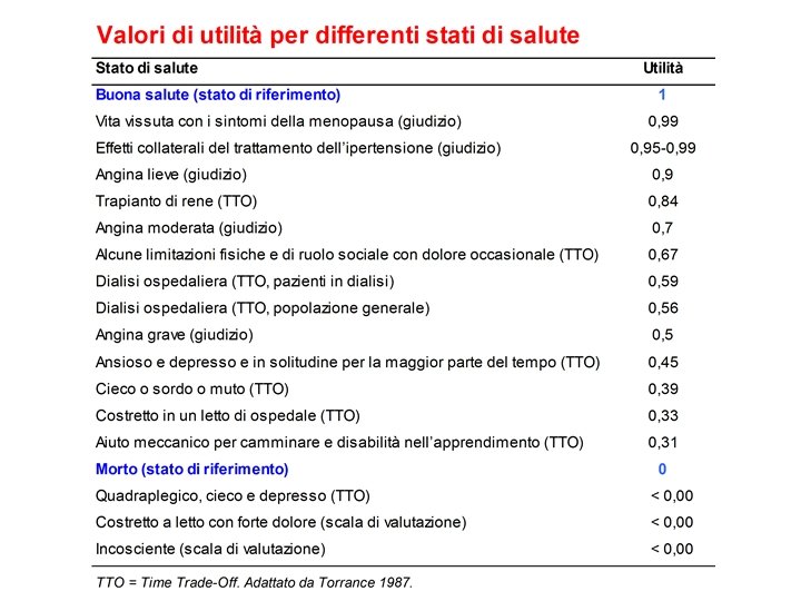 CARATTERISTICHE DEI QALY Restano ancora nel dibattito in letteratura alcuni problemi di costruzione e di validazione dei QALY: § gli individui attribuiscono utilità differente alla medesima condizione di vita (qualità) in relazione alla propria età, sesso e ceto sociale § il tempo trascorso in uno stato di salute influenza il livello di utilità ad esso attribuito § il tipo di malattia di cui si descrive il livello di qualità di vita influenza la manifestazione delle preferenze § gli individui attribuiscono utilità differenti alla medesima condizione a seconda che essi siano sani, malati o con una conoscenza indiretta della malattia es. operatori sanitari