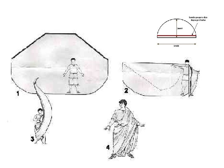 b. LA TOGA La toga era semejante al himation griego, pero más amplia, entre unos 2, 5 metros de ancho por 5, 2 de largo. Se disponía sobre el cuerpo formando pliegues; un extremo se colocaba sobre el pecho y, atravesando por encima del hombro izquierdo, rodeaba la espalda, volvía hacia adelante pasando por debajo del brazo derecho (que quedaba libre), de allí tornaba otra vez sobre el hombro izquierdo, cubriéndolo, y se ataba a la espalda. La toga de los senadores era blanca, con franjas de color púrpura. Los emperadores vestían una túnica bordada en oro y una toga bordeada de púrpura. El uso de la toga varió con el tiempo, mientras que en tiempos de la república era impensable no llevarla a los actos públicos, en tiempos imperiales su uso se circunscribió a su uso en tribunales, circo y teatro.