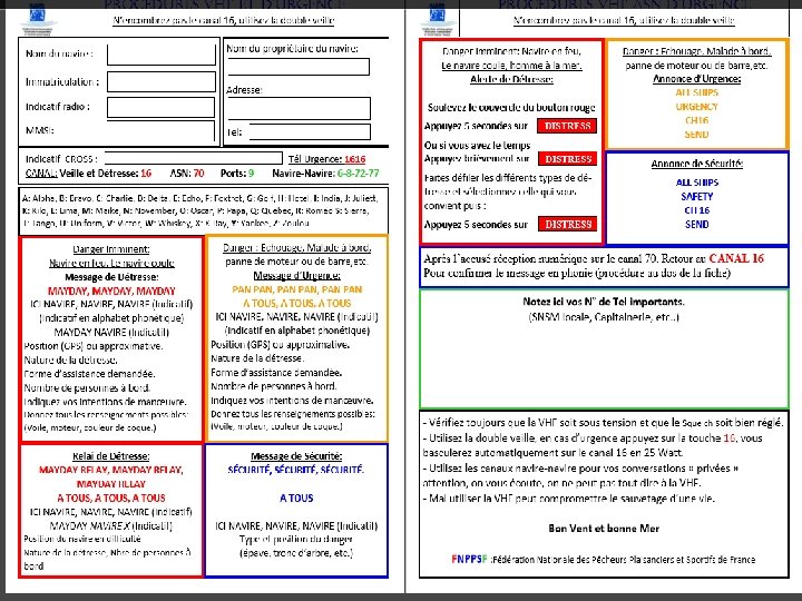 IMPORTANT : Les seuls cas où vous n’êtes pas obligés de vous diriger vers le navire en détresse sont : - S’il est trop loin, à la seule condition que d’autres navires plus proches interviennent. - Si votre intervention met votre navire sérieusement en danger (par exemple au milieu d’un champ de récifs si votre tirant d’eau est trop important). - Si les secours organisées (la SNSM ou la ROYALE) ont pris les choses en main et seront sur les lieux avant vous. Accusé de réception de détresse : MAYDAY « Nom du navire en détresse » 3 fois Ici « Nom du navire répondant » 3 fois MAYDAY REÇU « Position « Délai d’intervention » Si aucune station côtière ni navire de secours (SNSM) n’a accusé réception et/ou si d’autres moyens de secours vous semblent nécessaires, il faut relayer le MAYDAY sur le canal 16 : Relais de message de détresse : MAYDAY RELAIS 3 fois ICI « Nom du Navire qui transmet » 3 fois MAYDAY « Nom du Navire en détresse » Position (en latitude et longitude ou par rapport à un amer connu). Nature de la détresse Secours demandés (nature et importance) Les intentions du Commandant de bord Tous autres renseignements utiles Tous autres renseignements jugés utiles par le navire qui relaye.