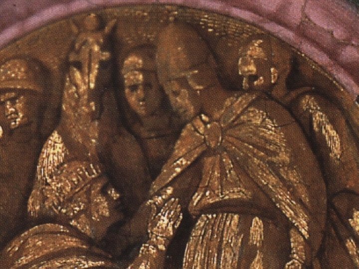 Con la sua sinistra tocca il tondo su cui è raffigurato il re Alessandro Magno che rende omaggio al sommo sacerdote in Gerusalemme.
