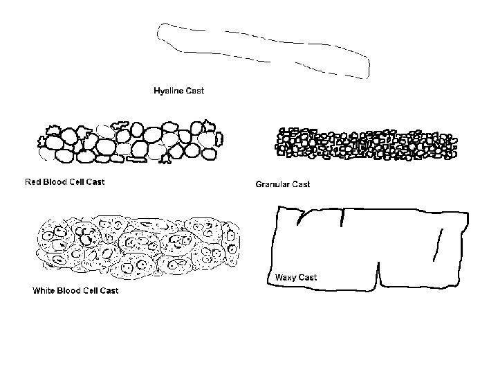 Types of Urinary cast • • Hyaline Cellular Granular Waxy casts • They represent different stages of degeneration of cells in a cast. Clinical indications • Casts in the urine always indicate some form of kidney disorder.