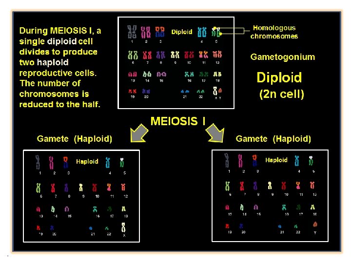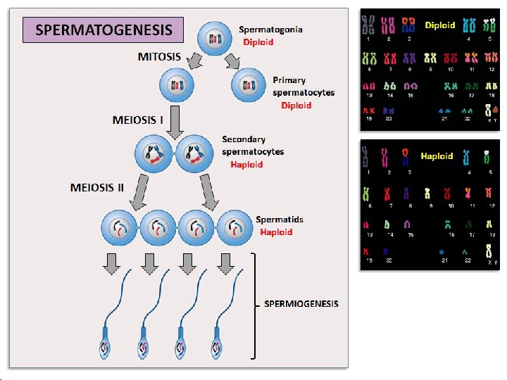 The cells that give rise to sperm and egg are diploid cells. When the cells that give rise to sperm and egg cells divide, the result is sperm or egg cells that have only half of the usual somatic number of chromosomes. Spermatogonium Diploid (2 n) Oogonium Diploid (2 n) MEIOSIS I Haploid (1 n)