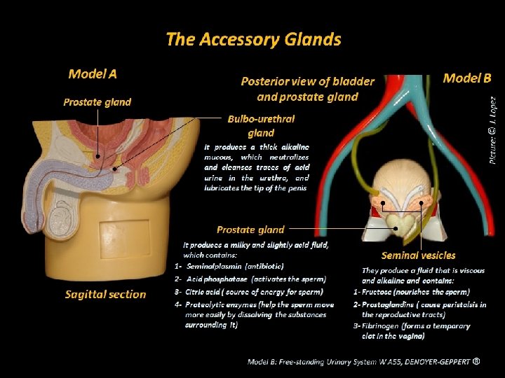 3: Accessory Glands They produce bulk of semen, because the seminiferous tubes, and the epididymis only contribute 5% of the volume of the semen Produce a fluid that is viscous and 1 Seminal alkaline and contains: vesicles - Fructose (nourishes the sperm), 2 - Prostaglandins ( cause peristalsis in the reproductive tracts), and 3 Fibrinogen (forms a temporary clot in the vagina) Prostate gland It produces a milky and slightly acid fluid, which contains: 1 - Seminalplasmin (antibiotic), 2 - Acid phosphatase (activates the sperm), 3 Citric acid ( source of energy), and 4 Proteolytic enzymes (help the sperm move more easily by dissolving the substances surrounding it) Bulbourethral gland It produces a thick alkaline mucous, which neutralizes and cleanses traces of acid urine in the urethra, and lubricates the tip of the penis