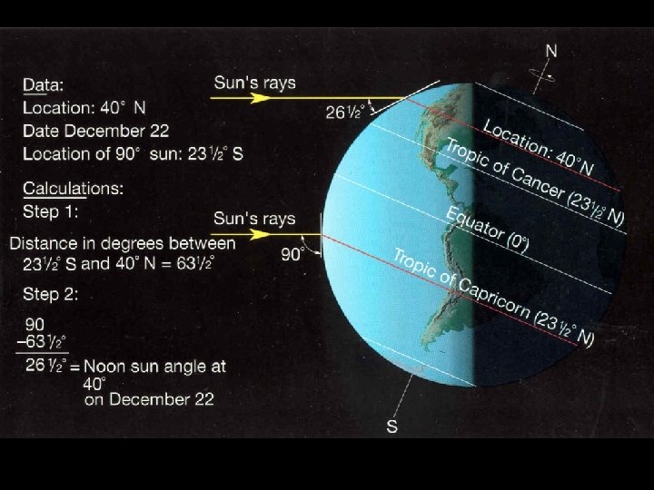 1. June 21: summer solstice (23½ °N) 2. NH tilted towards the sun SD = 23½°N 47° 1. 66. 5 – 23. 5°(SD) = 43°(ZA) 2. 90° – 43°(ZA) = 47°(SA)