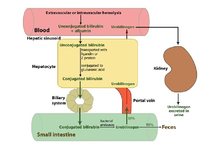 What is Bilirubin ? ? ? • is the product of heme degradation (80% hemoglobin, 20% other hemo-protein as cytochrome, myoglobin). • Bilirubin is transferred to liver to undergo further metabolic process called (conjugation) to make it more water soluble. • Then conjugated bilirubin is excreted in bile to help in food digestion and the excess amount is excreted in urine and stool. • Elevated levels of bilirubin in blood and urine indicate certain diseases.
