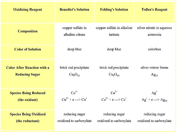 • Common oxidizing agents used to test for the presence of a reducing sugar are: Benedict's solution, Fehling's solution and picric acid solution. • An oxidizing agent (also called an oxidizer or oxidant) is referred to as a chemical compound that readily transfers oxygen atoms or a substance that gains electrons in a redox chemical reaction. • Aldose(glucose) ---- oxidation ----- carboxylate • Ketose(fructose) ----- oxidation----- hydroxyl carboxylate