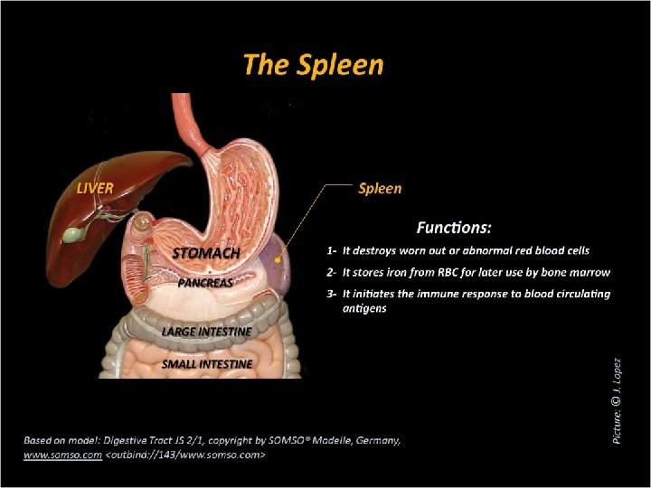 Histology of the Spleen White pulp of splenic nodule White pulp is dominated by lymphocytes. Capsule Red pulp contains a large number of red blood cells. Trabecular artery The spleen LM 50 Central artery in splenic nodule Functions: 1 - Removal of abnormal and worn out blood cells. 2 - Storage of iron recycled from red blood cells. 3 - Initiation of immune responses by B cells and T cells.