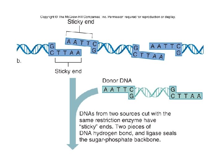 Cutting and Rejoining DNA v restriction enzymes (RE) produce specific DNA fragments for ligation Ø RE are defensive weapons against viruses Ø RE “cut” (hydrolyze) DNA at specific sites Ø RE “staggered cuts” produce “sticky ends” sticky ends make ligation more efficient Ø