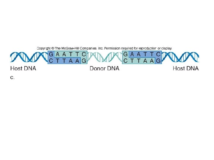 Creating Recombinant DNA Molecules v Cut DNA from donor and recipient with the same restriction enzymes v Cut DNA fragment is combined with a vector v Vector DNA moves and copies DNA fragment of interest v Vector cut with restriction enzymes v The complementary ends of the DNAs bind and ligase enzyme reattaches the sugar-phosphate backbone of the DNA