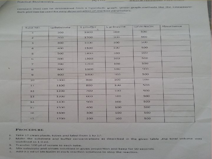 Study enzyme kinetics • Enzyme kinetics: the study of the rate at which an enzyme works. • To examine it, when the substrate available to the enzyme one would do the following: 1. set up the series of tubes containing graded concentrations of substrate 2. At time zero, a fixed amount of the enzyme preparation is added 3. Over the next few minutes, the concentration of product formed, is measured. If the product absorbs light, we can easily do this in a spectrophotometer 4. Early in the run, when the amount of substrate is in substantial excess to the amount of enzyme, the rate we observed is the initial of velocity Vi.