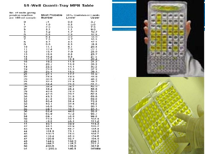 Principle: v The terms “coliform” and “faecal coliform” have no taxonomic validity and, therefore, are only meaningful when expressed in terms of the analytical test parameters of medium, time and temperature of incubation. v. The presence of “indicator organisms” in foods processed for safety may indicate one of the following possibilities: 1. inadequate processing and/or post-processing contamination; and/or 2. microbial growth. v The presence of coliforms, faecal coliforms and aerogenic E. coli in food and water may be determined by means of the MPN procedure.
