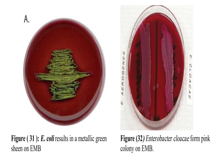 v. The eosin and methylene blue dyes cause lactose fermenters to have pink colonies. E. coli incorporates so much of the dye that the dyes precipitate in the cells and give the colonies a metallic green sheen. v Non-lactose fermenters will remain colorless or take on the color of the medium such as Salmonella (one of the causative agents of food poisoning). v Note: This media is used to confirm the presence of E. coli in water samples contaminated with sewage or fecal material. v You will use this agar again with in the water sampling experiment to differentiate between E. coli and Enterobacter.