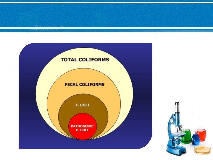 E. coli v E. coli is a type of fecal coliform bacteria commonly found in the intestines of warm blooded animals and humans. v The presence of E. coli in water is a strong indication of recent sewage or animal waste contamination.