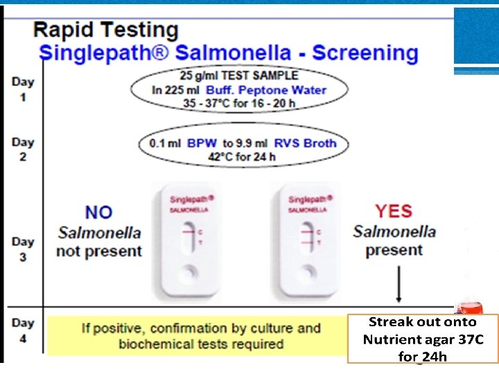 25 gm/ml test sample in 225 ml buffered peptone water ( BPW ) 16 – 20 h / 37 C 0. 1 ml BPW to 10 ml RVS broth( Modified semi-solid Rappaport Vassiladis Medium) 24 h / 41. 5 C XLD agar or any other Salmonella agar 24 h/ 37 C 1 ml BPW to 10 ml Muller Kauffman Tetrathionate Novobioicin Broth ( MKTTn Broth) 24 h/ 34 C XLD agar or any other Salmonella agar 24 h/ 37 C Interpretating of Growth on Plates For confirmation take 5 suspected colonies from each plate and streak onto Nutrient agar 18 - 24 h / 35 - 37 °C