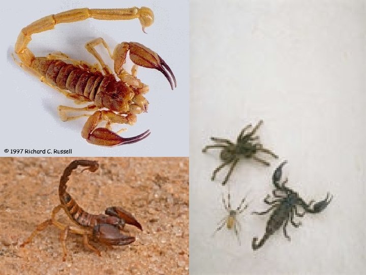 III. Class Archanida ( )ﺍﻟﻌﻨﻜﺒﻮﺗﻴﺎﺕ ülike spiders, scorpions, ticks & mites. üThey are characterized by having: A. 2 body regions…… cephalothorax & abdomen. B. In adult 4 pairs of legs, on the cephalothorax. No appendages on abdomen. C. No sensory antennae. D. Mouth parts all of sucking types (piercing, cutting, rupturing and then sucking). mouth parts composed of chelicerae & peripoda.