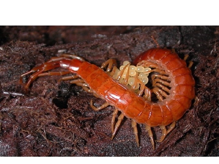 Chilipoda (centipeds )ﺍﻡ ﺳﺒﻌﻪ ﻭﺳﺒﻌﻴﻦ : v. Many broad segments, v. One pair of legs in each segment, v. Predacious on other small arthropods, v. Provided with poison glands, v. First pair of leg modified into claws to inject poison Claws v. Painful bite may be killing. 1 pair of legs -segment