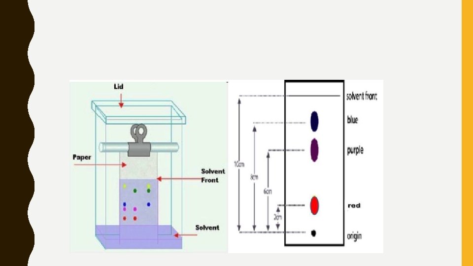 CHROMATOGRAPHY • A method of separating a material by moving a mobile phase through a stationary phase. • A simple example is paper chromatography. • A sample soluble in a solvent is placed on paper. The paper is then place in the solve so that the sample is above the solvent. • The solvent climbs up the paper by capillary action and separates the sample because they have different mobility rates.