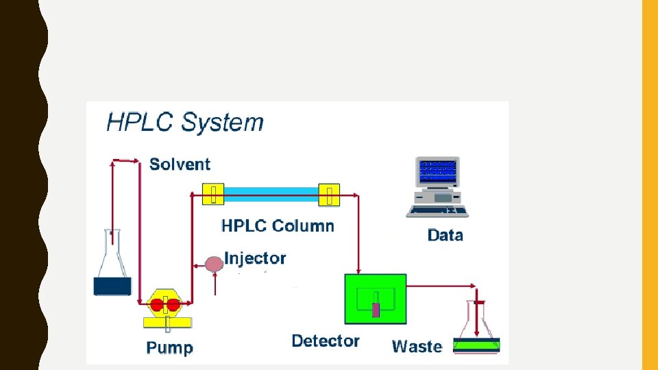 HIGH-PERFORMANCE LIQUID CHROMATOGRAPHY (HPLC) • Works is a manner similar to regular chromatography, except the liquid mobile state is pressurized by a pump. • This forces the mobile state through the stationary phase.